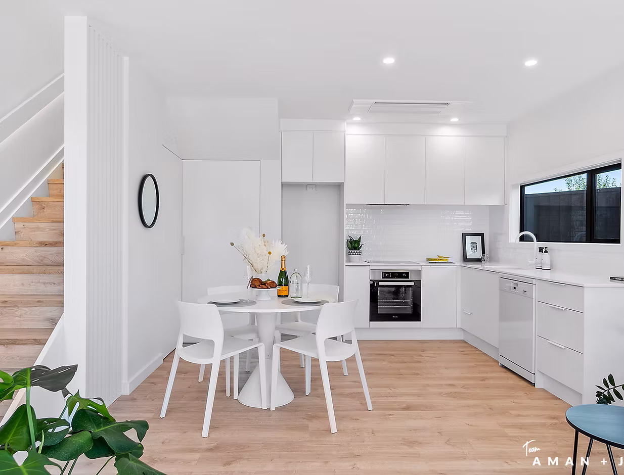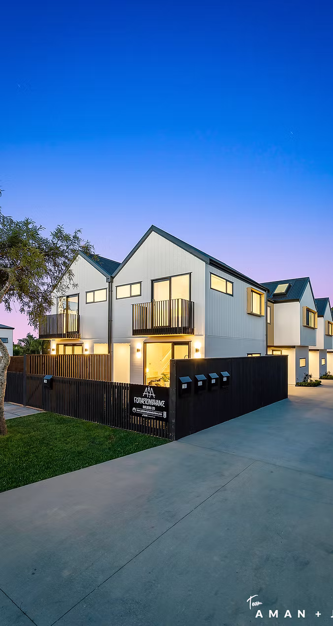 The development was designed to maximise an 809sqm site, the original dwelling was up-cycled and these townhouses, with a mix of 2, 3 and 4 bedroom options were designed for and built by A&A Fotheringhame Builders Ltd. Externally, they appear uniform with a mixture of white Nuwall and straw Abodo cladding. Large floor to ceiling windows and skylights throughout provide a light bright space. Internally each have a different colour palette to suit a variety of tastes. From an all white modern sleek 2 bedroom townhouse to a 4 bedroom family home with warm timber finishes and copper fittings throughout.